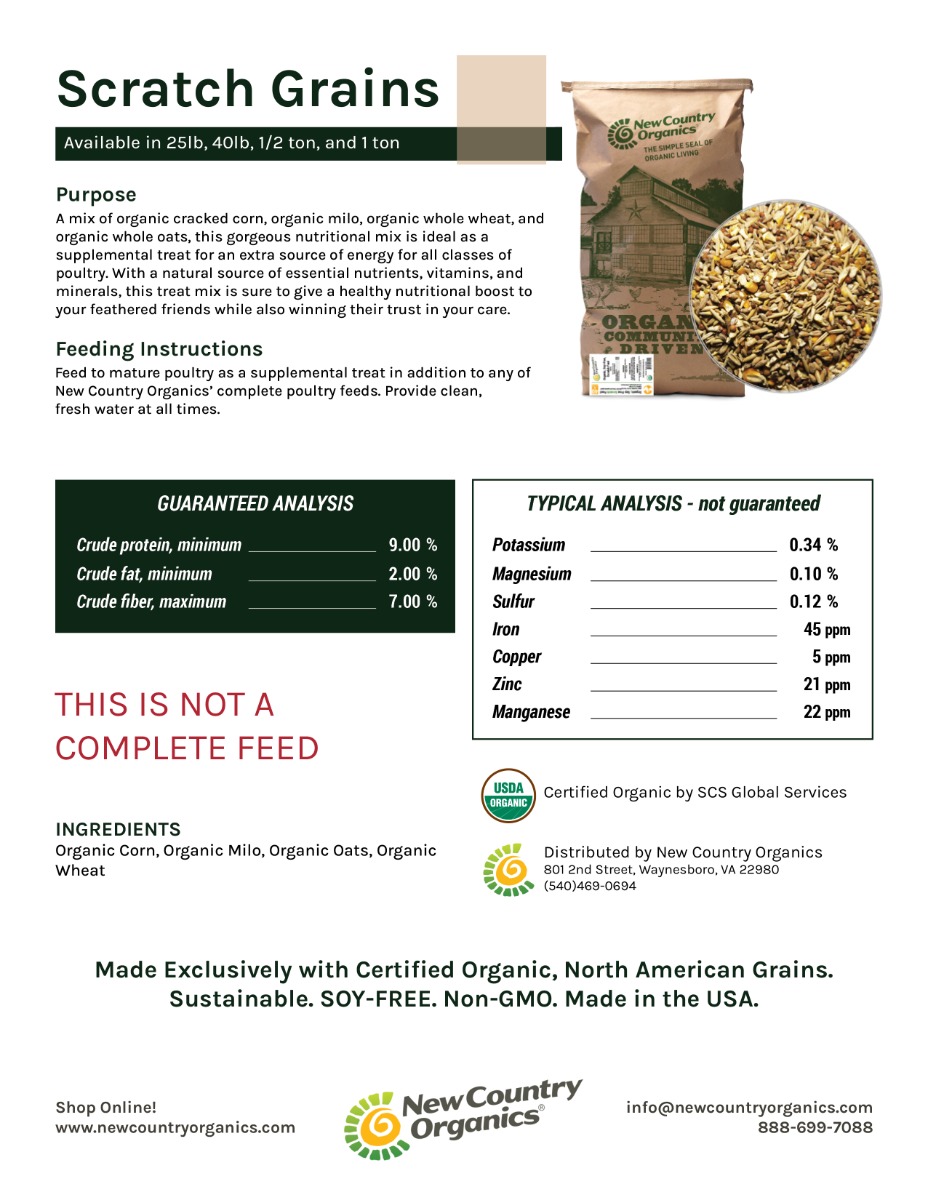 New Country Organics Scratch is a mix of organic cracked corn, organic milo, organic whole wheat, and organic whole oats. This gorgeous nutritional mix is ideal as a supplemental treat for an extra source of energy. This chicken scratch can be fed to all classes of poultry. With a natural source of essential nutrients, vitamins, and minerals, New Country Organics Scratch treat mix is sure to give a healthy nutritional boost to your feathered friends.